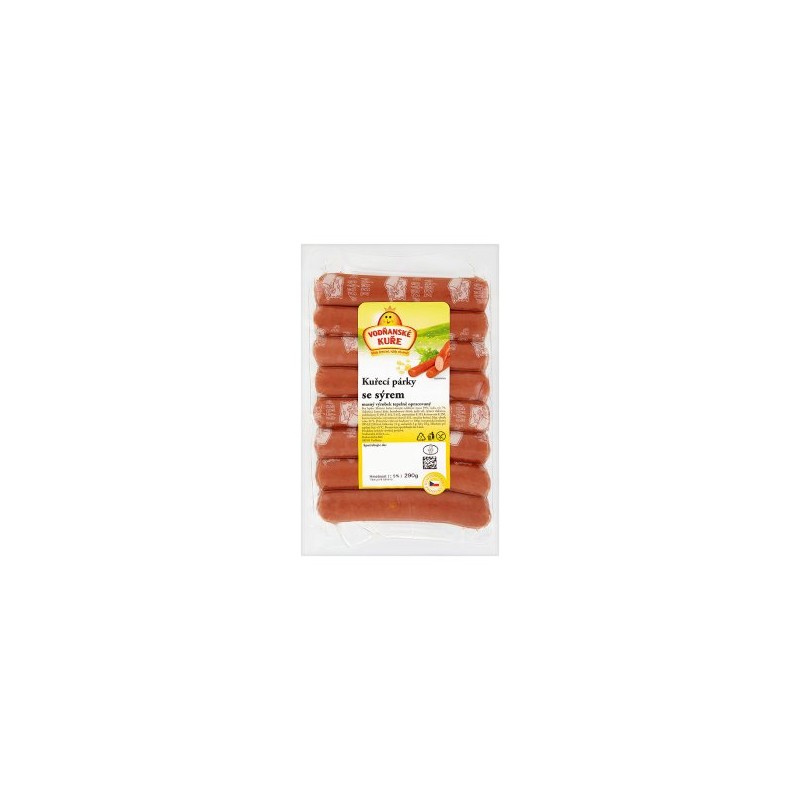 Kuřecí párky se sýrem. Masný výrobek tepelně opracovaný.