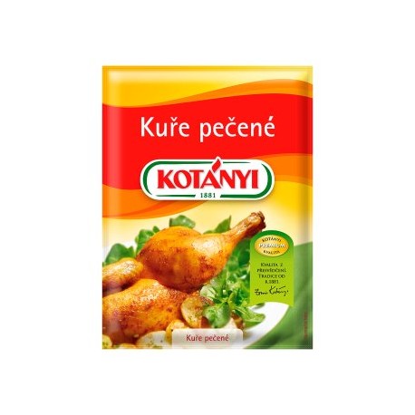 Příprava: Kuře před pečením omyjeme a důkladně zevnitř i vně potřeme směsí KOTÁNYI Kuře pečené. Kuře můžeme pokropit 1 polévkovou lžíci olivového oleje a dovnitř vložit trochu másla. Necháme cca 10 minut odležet. Kuře pečeme na oleji s máslem a trochou vody při teplotě cca 190°C asi 45 minut do křupava. Během pečení kuře otáčíme, podléváme vodou a přeléváme vypečenou šťávou. Do vypečené šťávy přidáme půl lžíce mouky, rozšleháme a povaříme - získáme tak výbornou omáčku. Brambory můžeme uvařit nebo upéci v troubě na plátky nakrájené osolené a ochucené např. rozmarýnem.