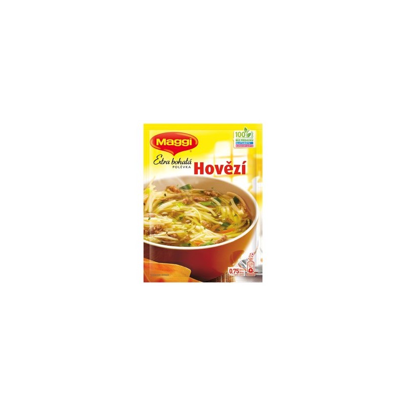 Nová polévka MAGGI Extra bohatá Hovězí je plná kvalitních ingrediencí, které zasytí. Připravíte z ní 3 porce (0,75 l) polévky. Je bez přídavku glutamanu sodného a konzervantů.